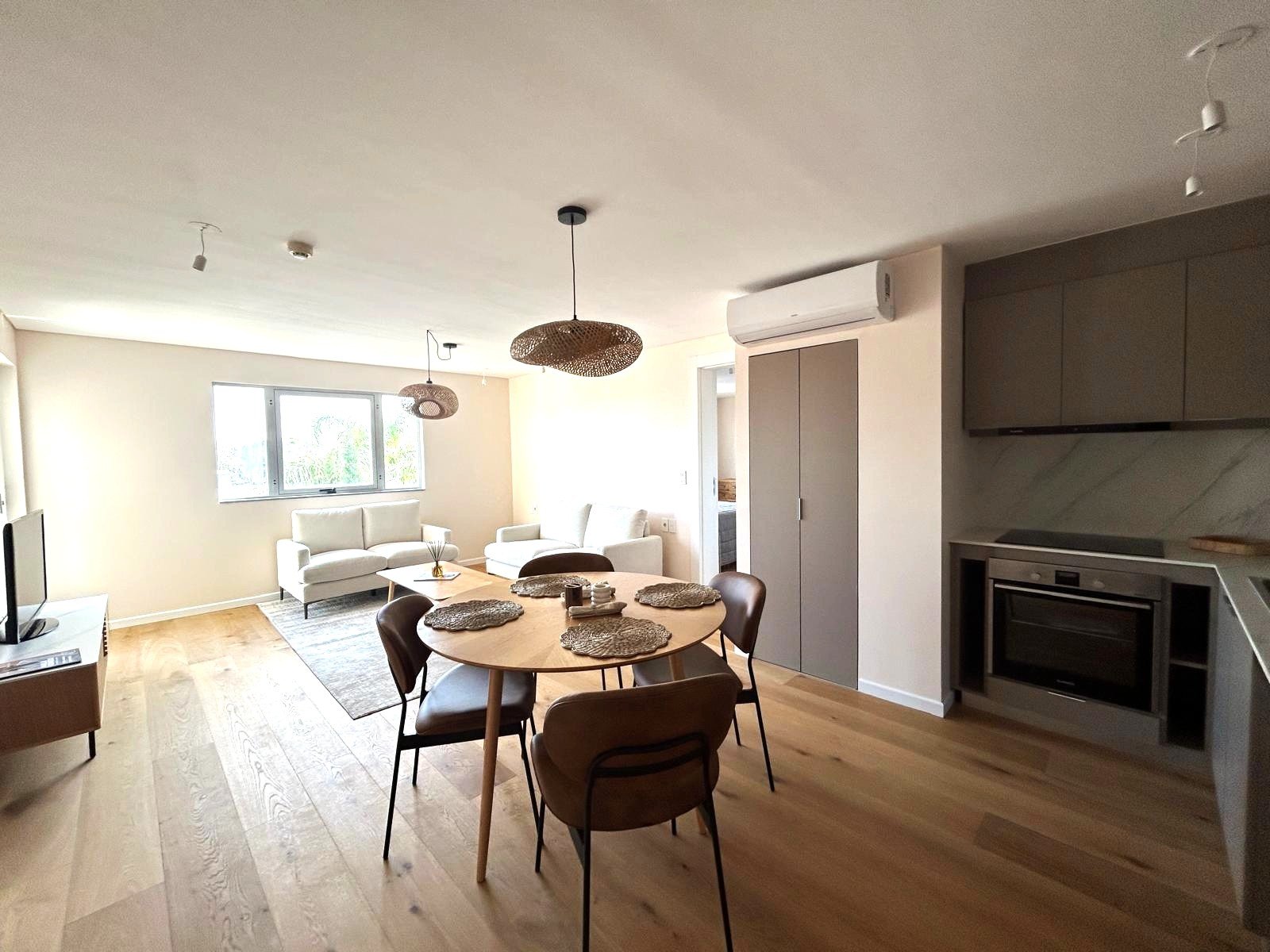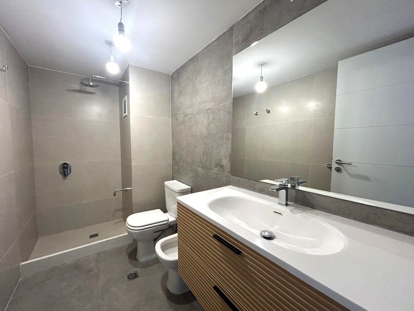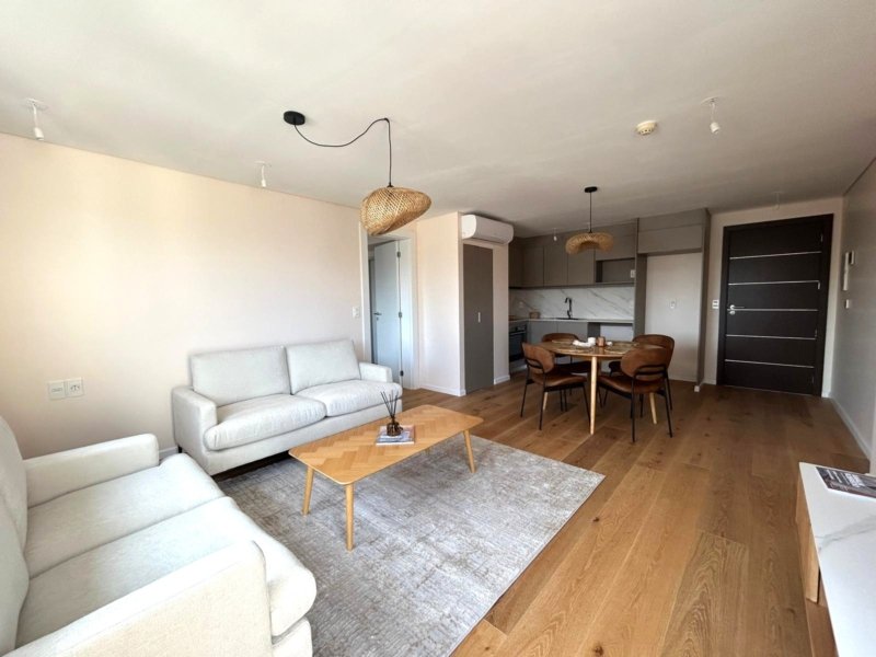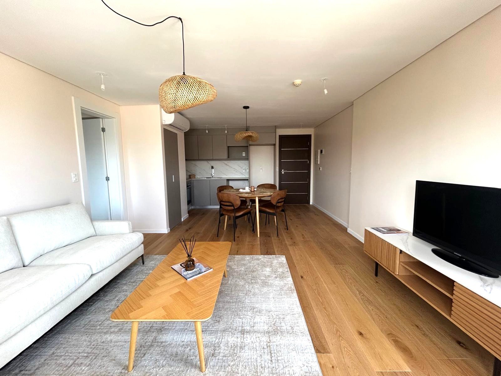 En su interior cuenta con living comedor con vista a espacios verdes, cocina integrada equipada con placares, horno eléctrico, campana extractora y anafe. El dormitorio principal posee baño en suite, placard con puerta espejo y espacio suficiente para escritorio, además de aire acondicionado. El apartamento dispone también de área de lavandería con conexión para lavadora y secadora.