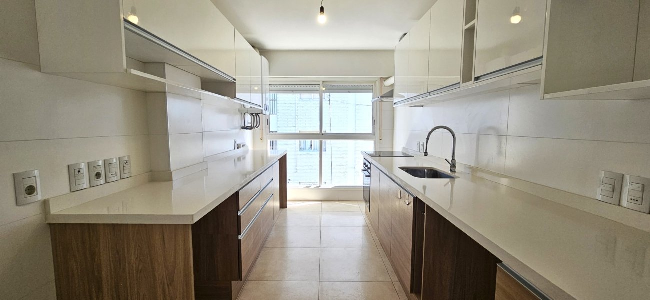 La cocina está equipada con anafe vitrocerámico, horno, microondas, campana de extracción, doble mesada y una importante capacidad de almacenamiento gracias a los placares superiores e inferiores. Cuenta además con conexiones para lavarropa y secarropa, junto a una caldereta a gas dual.