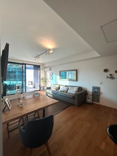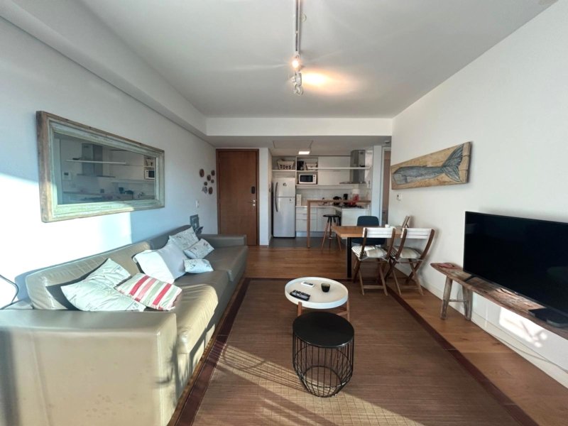 Living comedor equipado muy coqueto, cocina semi integrada con línea blanca.